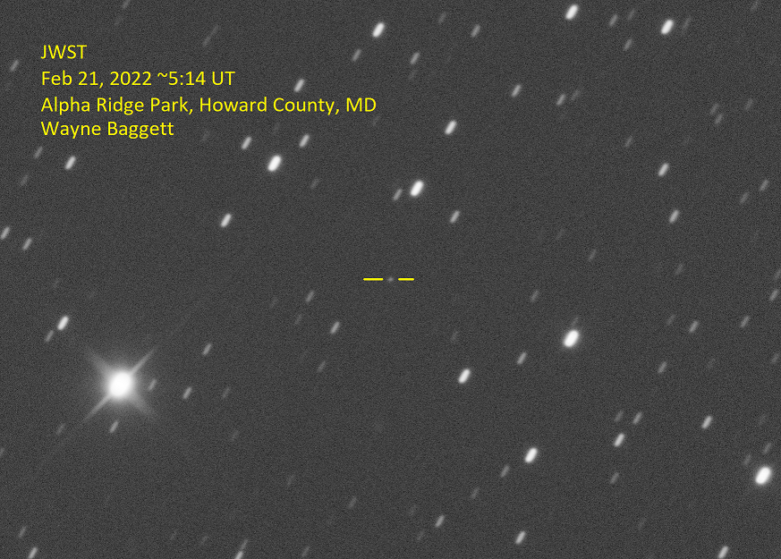 The image at right shows the motion of JWST from 11:36pm - 12:15am. This